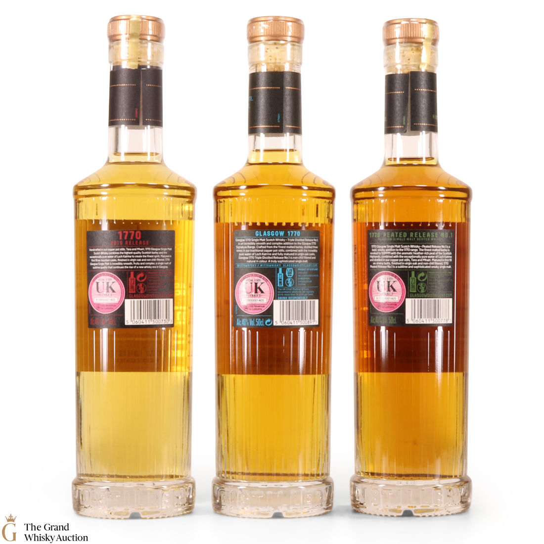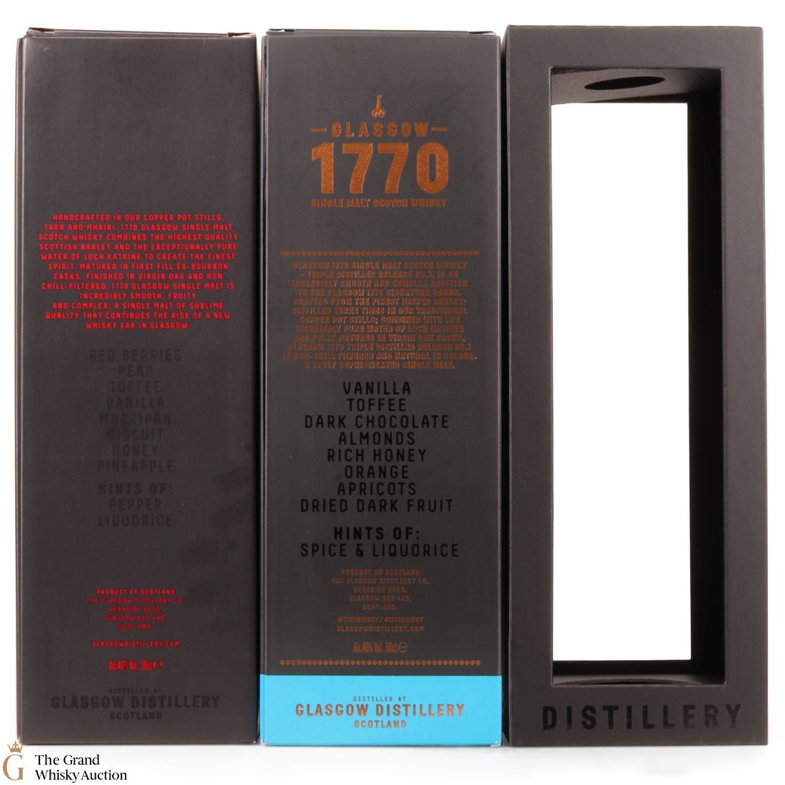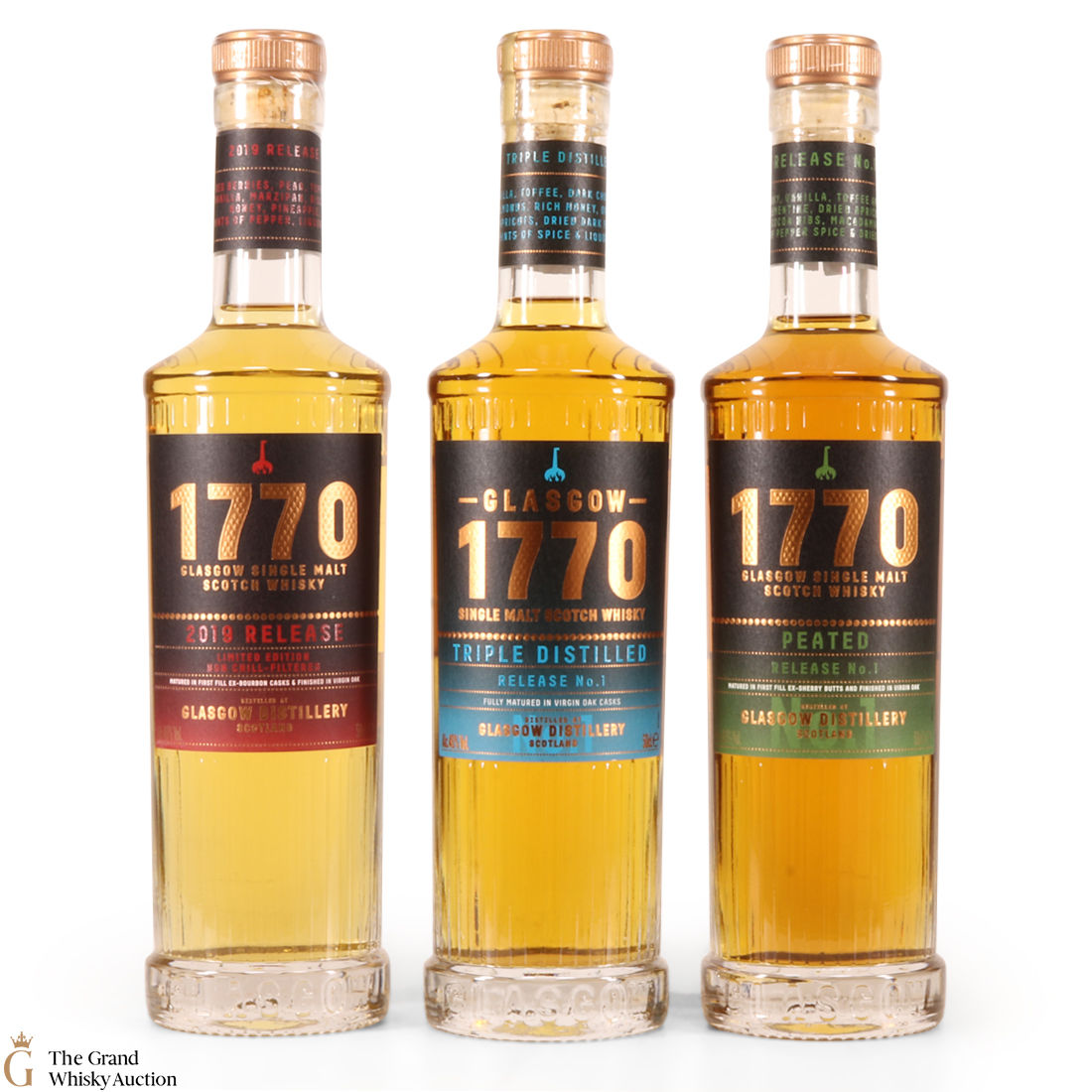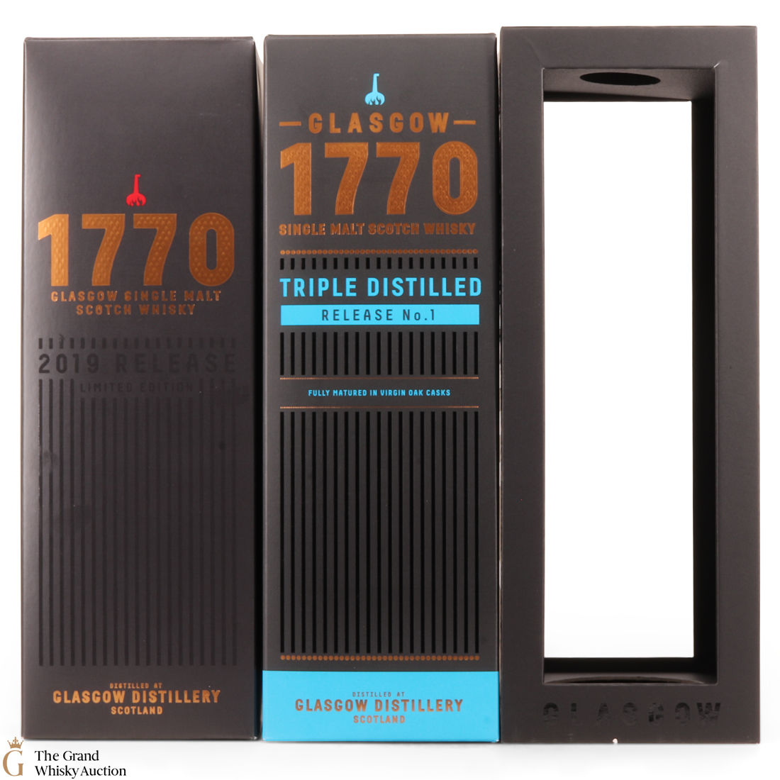 This lot includes 3 x 2019 releases from Glasgow Distillery: 770 Single Malt Scotch Whisky 2019, 1770 Peated & 1770 Triple Distilled. It also comes with 2 x branded glasses.