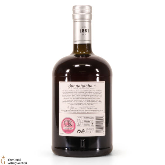 This is a 2019 distillery exclusive from Bunnahabhain Distillery. This Amontillado Cask Finish limited edition started life on the 20th of February 2003 in refill hogsheads before being transferred to Amontillado sherry hogsheads on the 26th of February 2016 where it spent two more years maturing in Bunnahabhain's coastal warehouses.