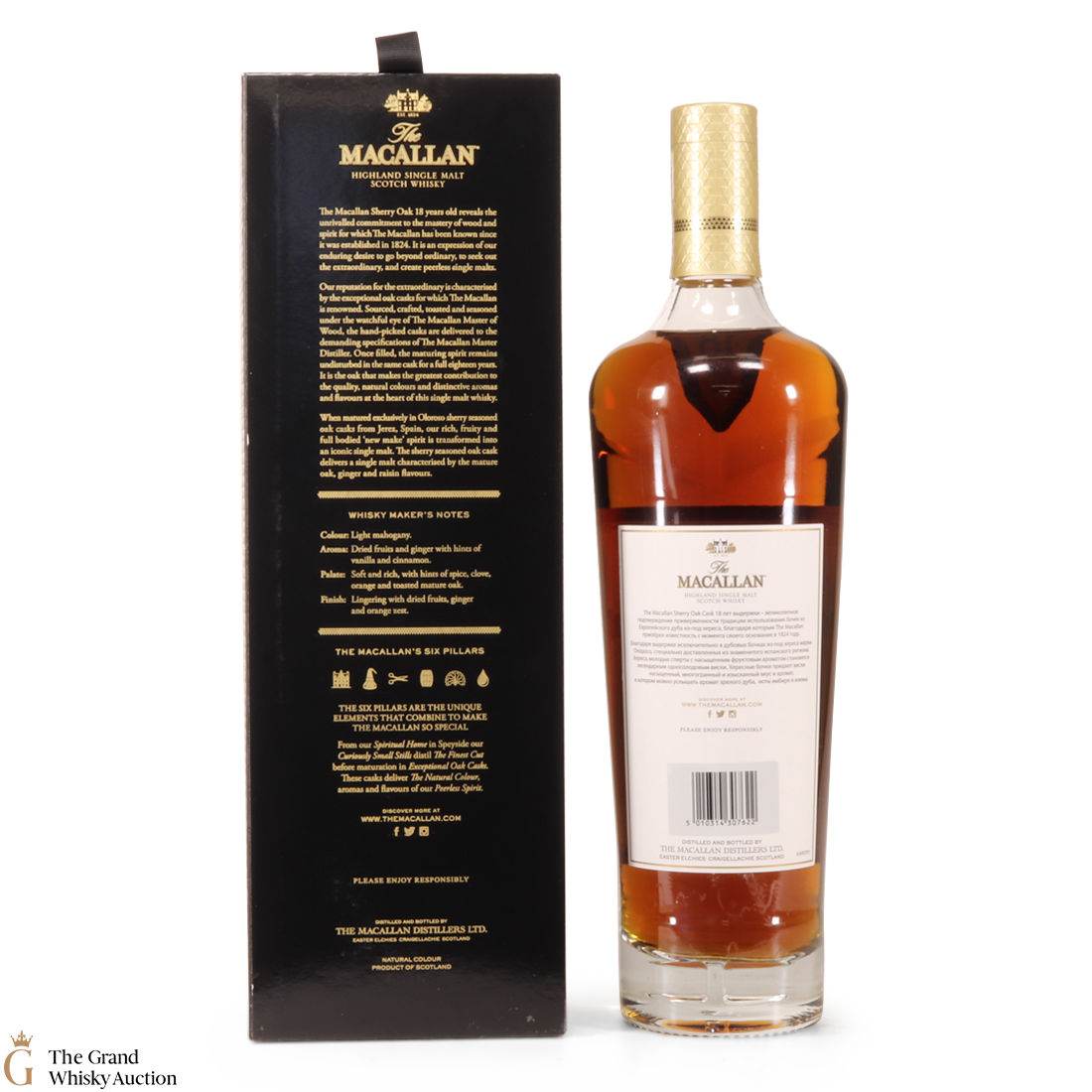 This annual release of The Macallan's popular 18 Year Old Sherry Oak is matured exclusively in sherry seasoned casks, built from both Spanish and American oak, providing a beautifully dark flavour with rich aromas.