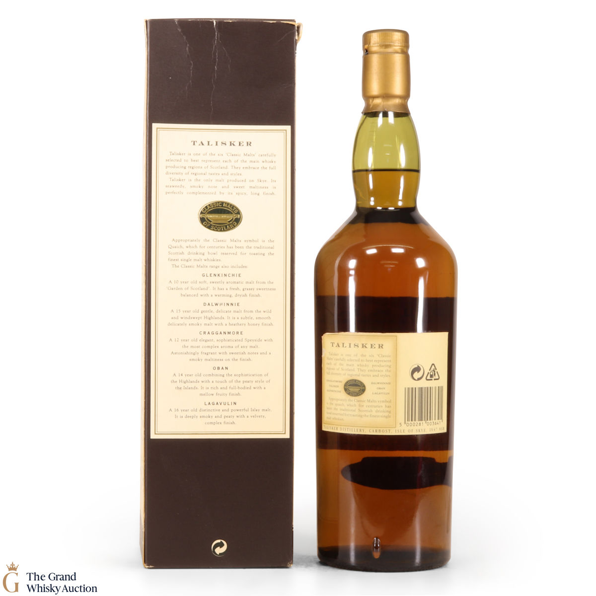 An older release of 10 Year Old from Talisker distillery on the Isle of Skye. Aged for a minimum of 10 years in American oak casks. The bottle label and the box feature a map of Skye. This is a 1L bottle.