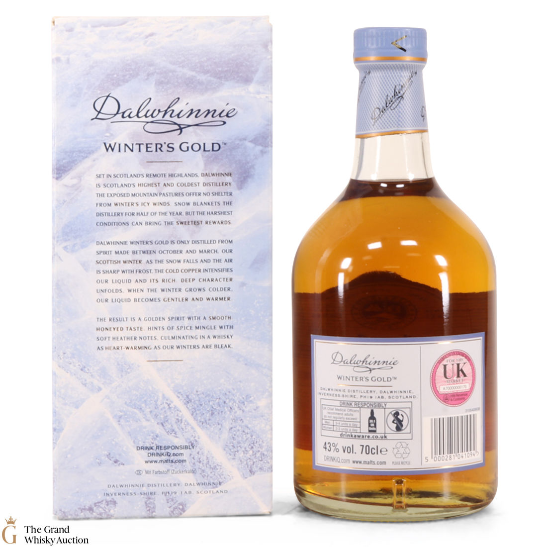 Due to the various ages of bottles and their seals, the condition of liquid is at the buyer's discretion and no claim can be lodged against failure/leakage in transit. Loss and breakage cover is available at 3% of the hammer price as standard. If the lot is not insured, no claim can be lodged against the courier or The Grand Whisky Auction for breakage or loss in transit.