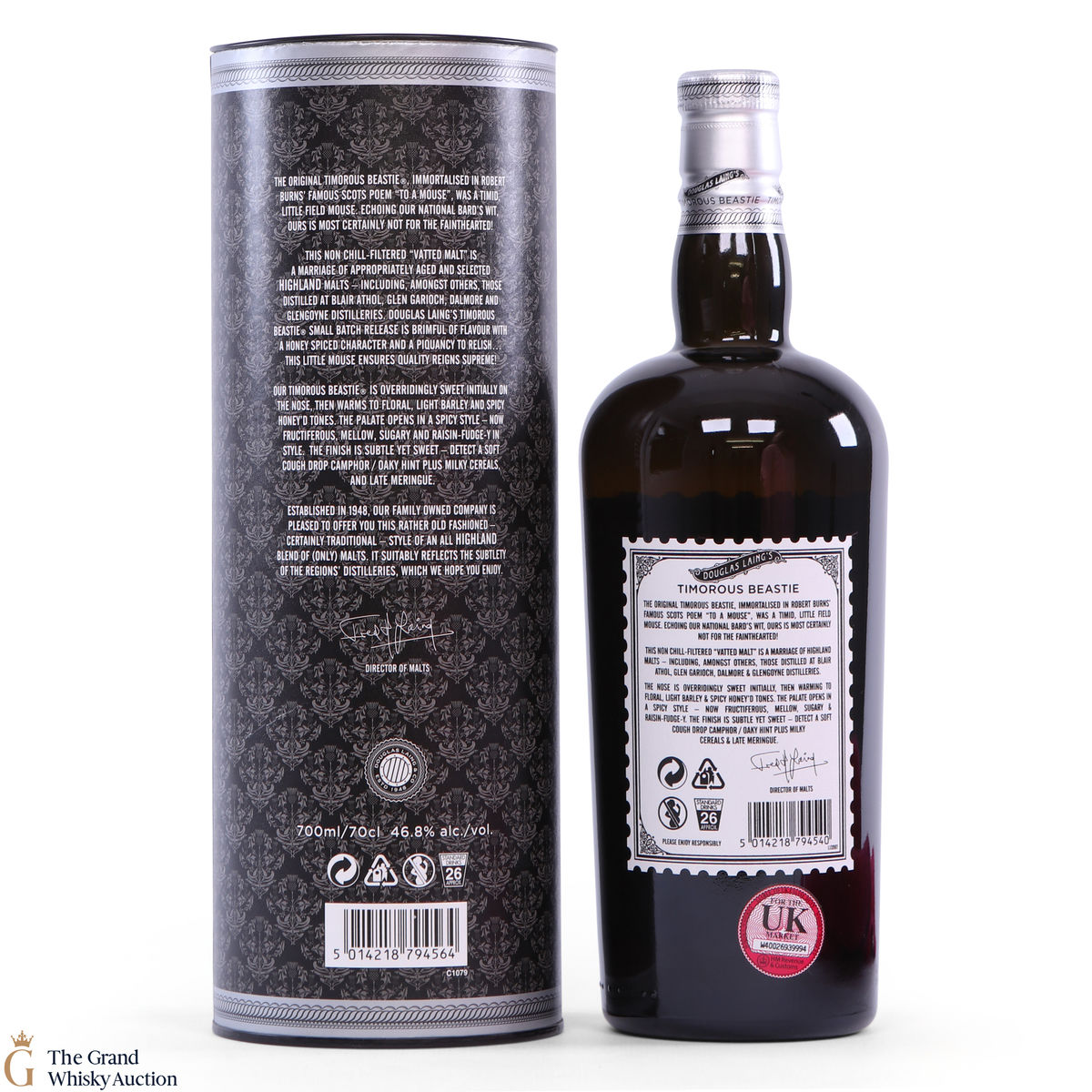 A limited-edition bottling of this small batch #1. The Timorous Beastie Highland blended malt Scotch whisky was matured and bottled at 46.8% ABV. It has tasting sweet tasting notes including warm syrup over sponge and ripe, juicy nectarines.