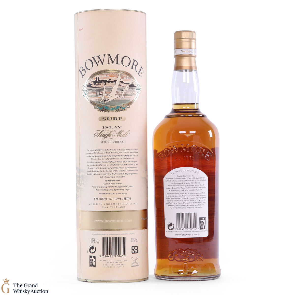 Bottles for the travel retail market, this Bowmore has a nose of sea spray and peat smoke. The Bowmore distillery is the oldest established one on Islay. It was founded in 1779.