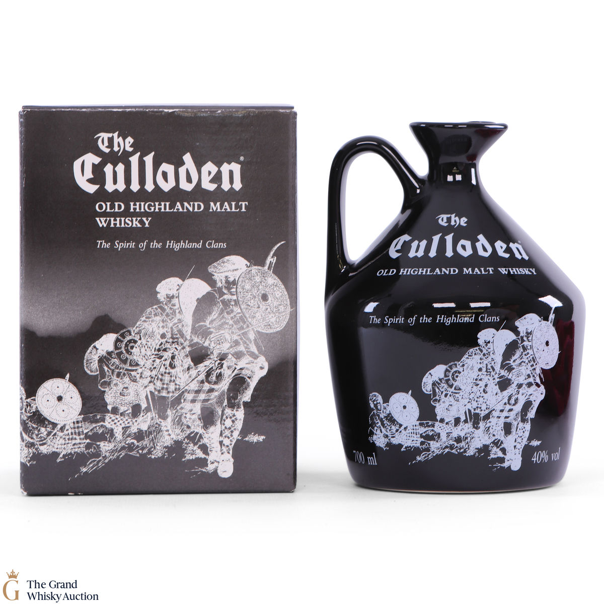 A striking black ceramic decanter commemorating the battle of Culloden and 'The Spirit of the Highland Clans'.