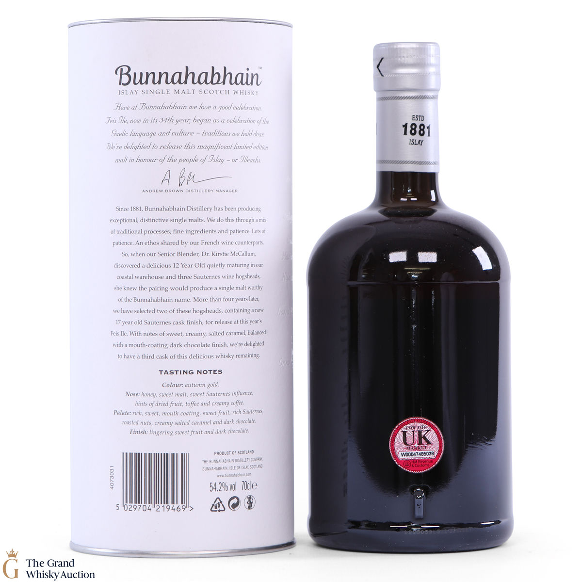 This limited edition single malt from Bunnahabhain Distillery has been matured for 17 years. For the last 5 years, the whisky was finished in Sauternes hogsheads. This release is one of 3 by Bunnahabhain for Fèis Ìle 2019. It has been bottled at 54.2% ABV. This is one of only 1118 bottles produced.