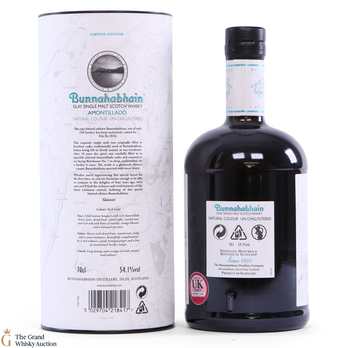 A 16-Year-Old Bunnahabhain exclusively sold at the distillery during Feis Ile 2016. Matured in Bourbon casks for 10 years then finished in Amontillado casks for six years. This is a very limited one of only 250 bottles.