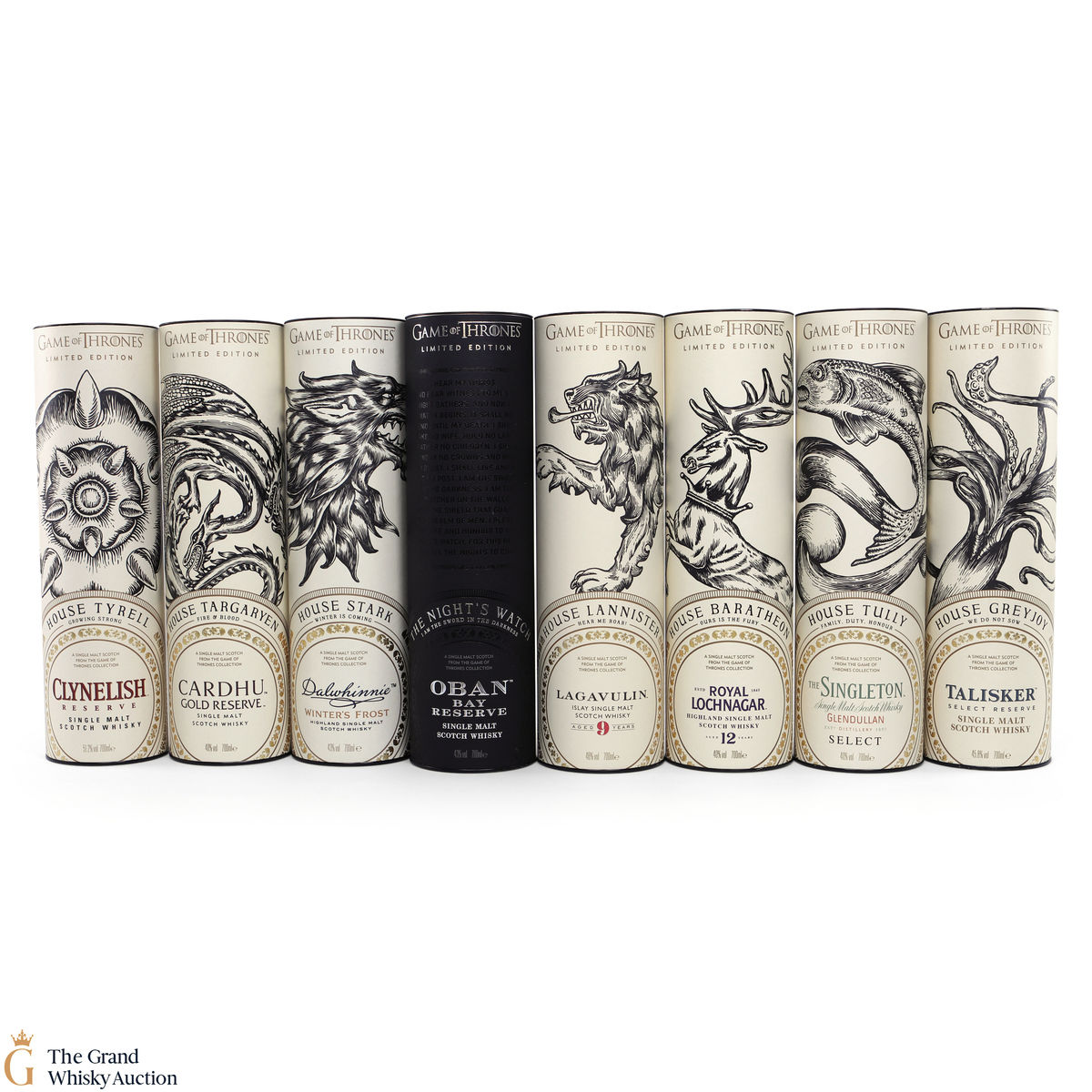 Each of the Game of Thrones Scotch whiskies has been paired with a particular house from the seven kingdoms in the television series, plus the Night’s Watch guard.