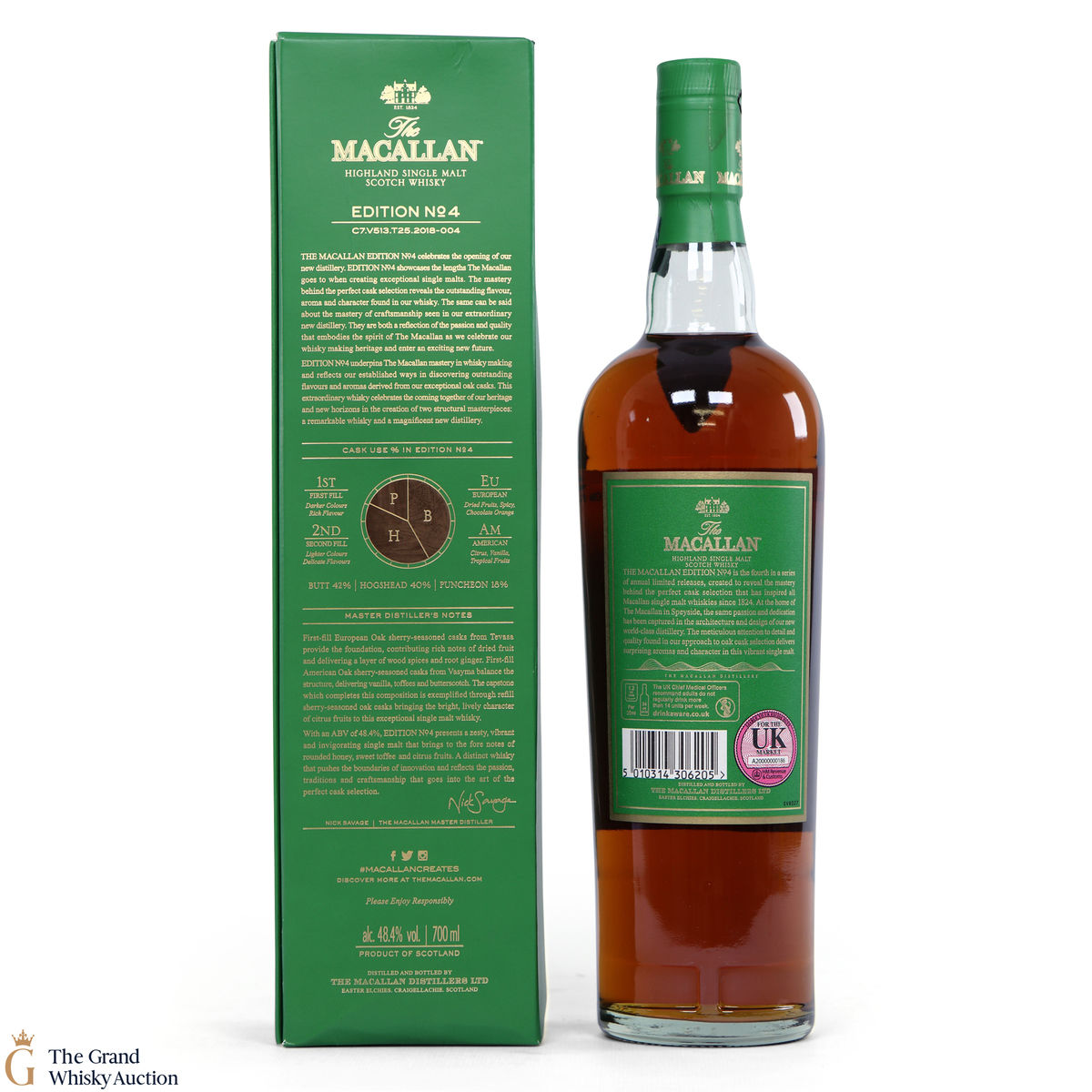 The fourth release in the Edition Series from The Macallan, this Speyside single malt is a celebration of the distillery's whisky making heritage, combining a unique selection of oak cask styles. Edition No.4 reflects the craftsmanship and pioneering design of the new Macallan distillery.