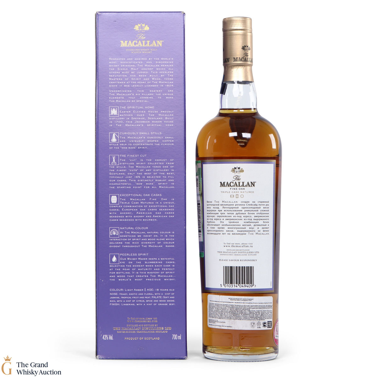 An 18 year old single malt, part of Macallan's Fine Oak range. It has been matured for eighteen years in three oak cask types; Europen oak seasoned with sherry, American oak seasoned with sherry and American oak seasoned with bourbon. This complex combination of casks has created a light amber single malt with tropical flavours balanced with wood smoke.