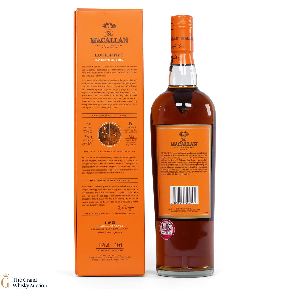 This is the second release from the Macallan Edition series. Edition No.2 is a collaboration between Macallan's master blender Bob Delgarno and legendary Spanish chefs Joan, Josep and Jordi Roca. The Rocas are the three brothers behind El Celler de Can Roca (named Best Restaurant in the World twice by Restaurant magazine). This single malt was drawn from a combination of sherry puncheons, butts and refill hogsheads.