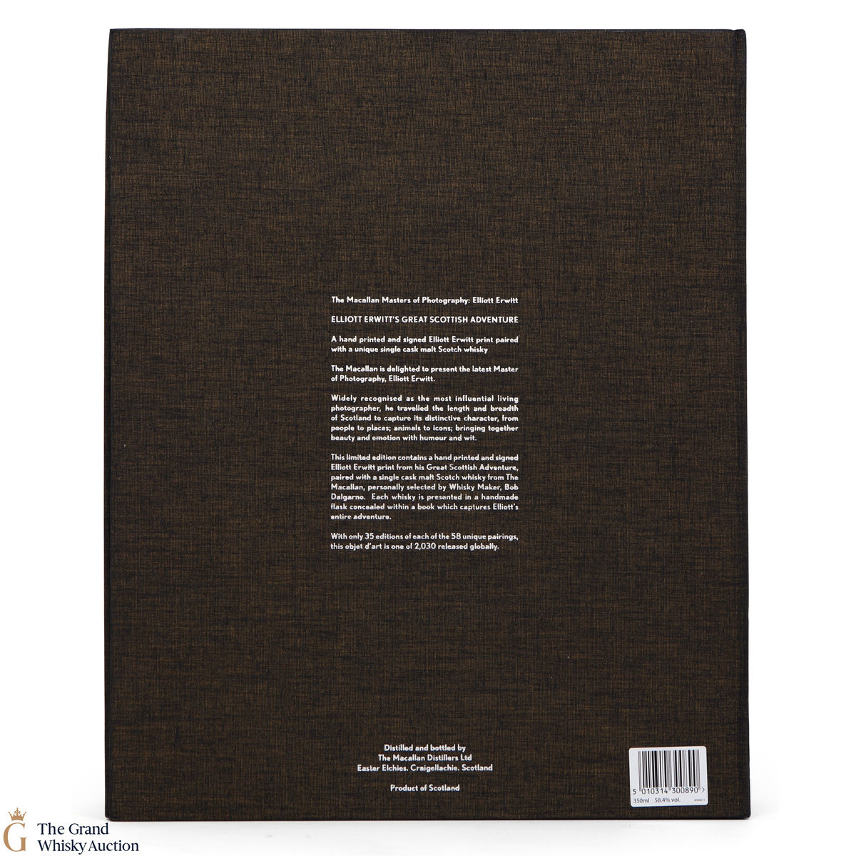 From the distillery - "The Masters of Photography: Elliott Erwitt Edition was The Macallan’s most extensive, and ambitious to date, with 58 unique single cask whiskies being paired with a different signed print captured during his Scottish adventure. Only 35 of each of the exclusive pairings were made available, a complete global release of 2,030."