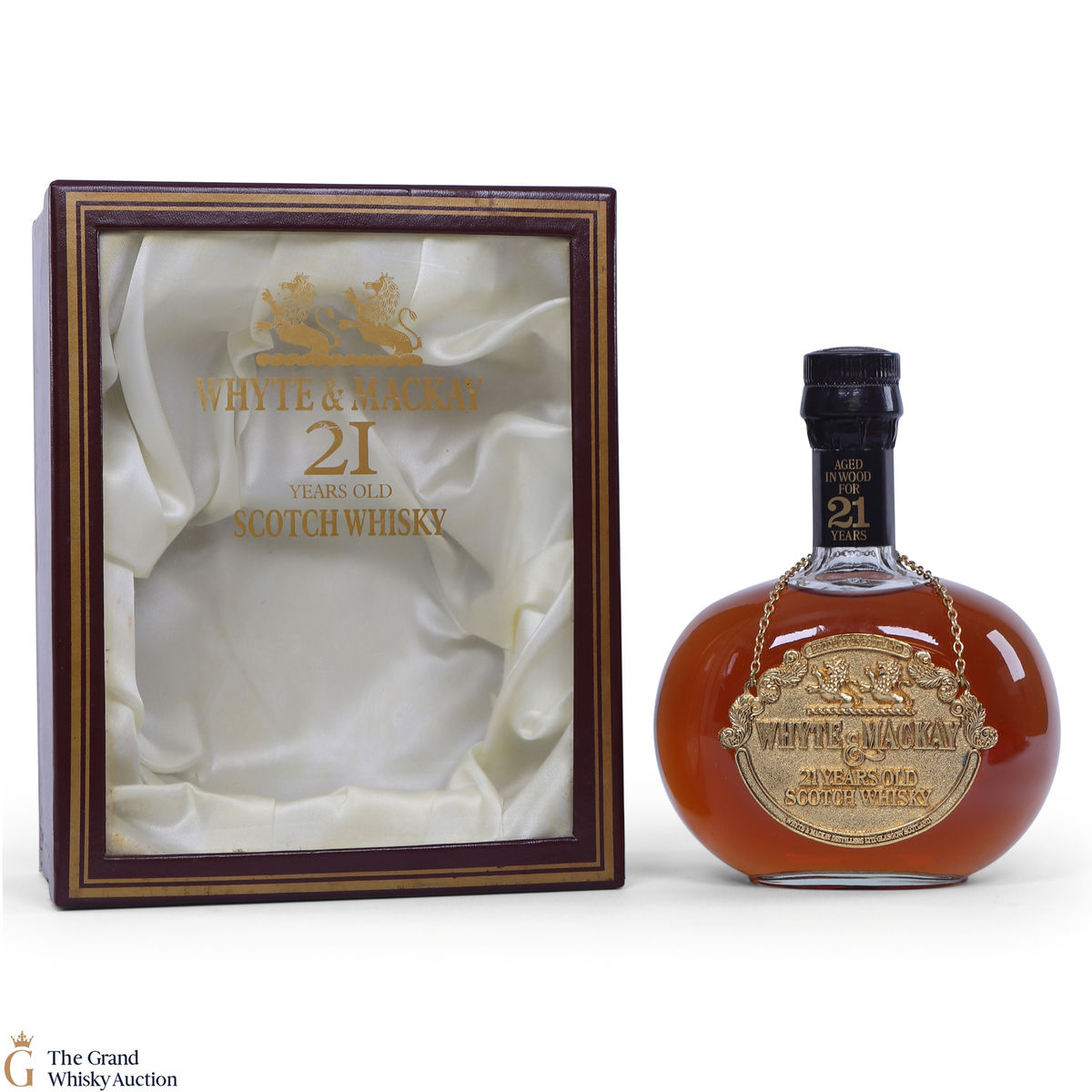 This is a very nicely presented bottle of 21-year-old blended whisky from Whyte & Mackay, which is believed to be produced in the 1980's. The bottle comes with a metallic tag that hangs from the neck of the decanter. It also comes in a beautiful silky lined presentation box.