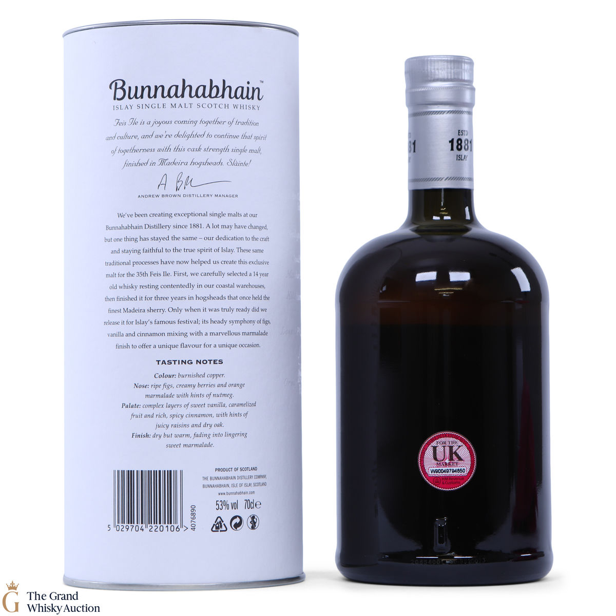 This limited edition single malt from Bunnahabhain Distillery was matured for 14 years in classic bourbon barrels, then finished in Maderia casks for another three years. Bottled at 53%, and released by Bunnahabhain for the 25th anniversary of Fèis Ìle - Fèis Ìle 2020. This is one of only 1164 bottles produced.
