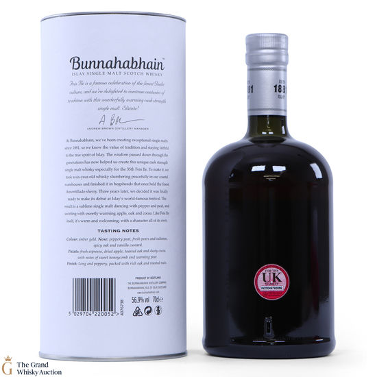 This limited edition single malt from Bunnahabhain Distillery was matured for 6 years in classic bourbon barrels, after which the single malt was transferred to Amontillado sherry Hogsheads for another three years. It was bottled at 56.9% and was released by Bunnahabhain for Fèis Ìle 2020. This is one of only 1658 bottles produced.