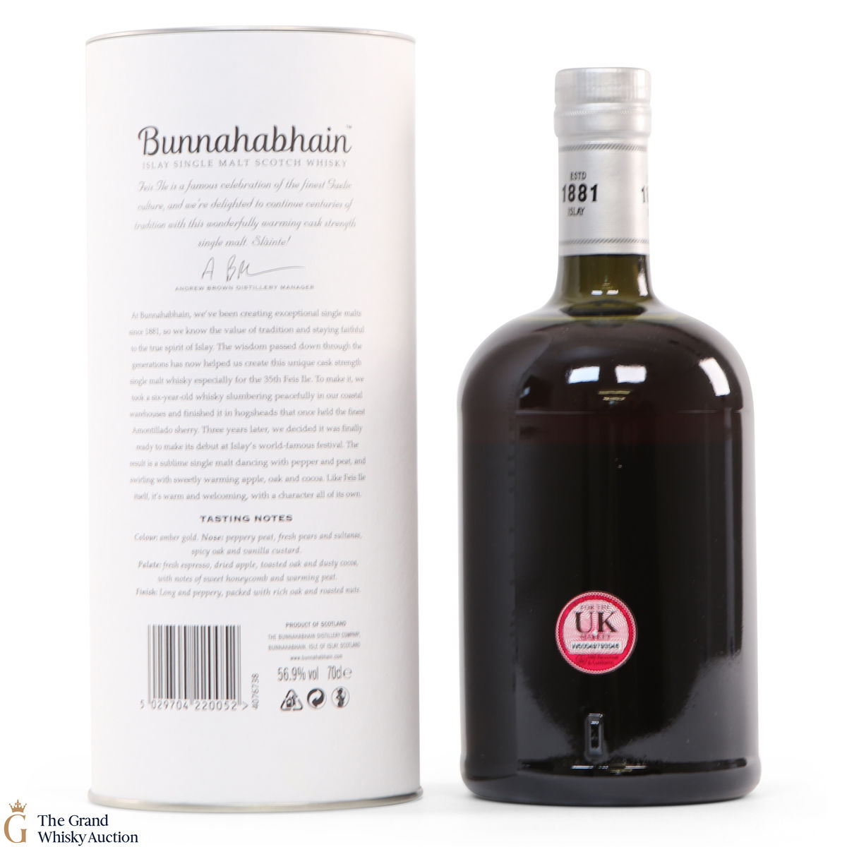 This limited edition single malt from Bunnahabhain Distillery was matured for 6 years in classic bourbon barrels, after which the single malt was transferred to Amontillado sherry Hogsheads for another three years. It was bottled at 56.9% and was released by Bunnahabhain for Fèis Ìle 2020. This is one of only 1658 bottles produced.