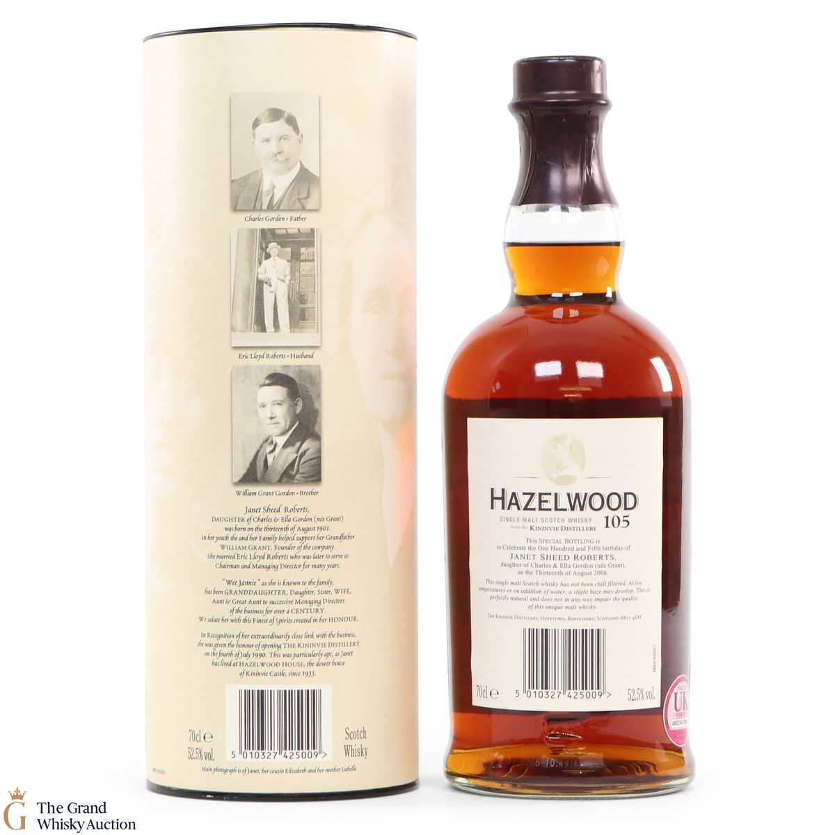 This is a special bottling of Hazelwood whisky to celebrate the 105th birthday of Janet Sheed Roberts on August 13th 2006. It is also it is the first bottling of single malt whisky from Kininvie distillery.