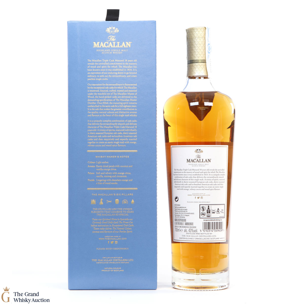 This 18 year old Macallan single malt was released in 2018 and sits is at the top of the Triple Cask range (which replaced the Fine Oak range). The whisky was matured in a combination of European sherry seasoned casks, American sherry seasoned casks and American ex-bourbon casks. This expression boasts bountiful notes of vanilla, dried fruit and woody spice.