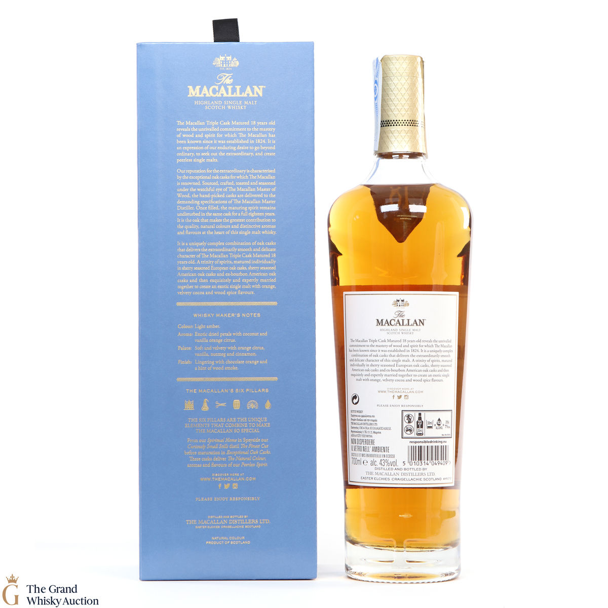 This 18 year old Macallan single malt was released in 2018 and sits is at the top of the Triple Cask range (which replaced the Fine Oak range). The whisky was matured in a combination of European sherry seasoned casks, American sherry seasoned casks and American ex-bourbon casks. This expression boasts bountiful notes of vanilla, dried fruit and woody spice.