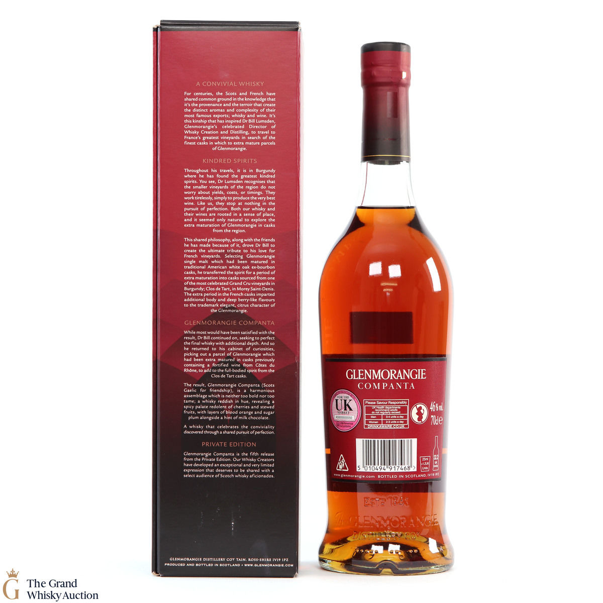 After first maturing in American white oak ex-bourbon barrels, the Companta was matured in 60% Burgundy wine casks from Clos de Tart and 40% Rhône Valley casks that previously held Rasteau, sourced by Glenmorangie's Director of Distilling, Dr. Bill Lumsden.