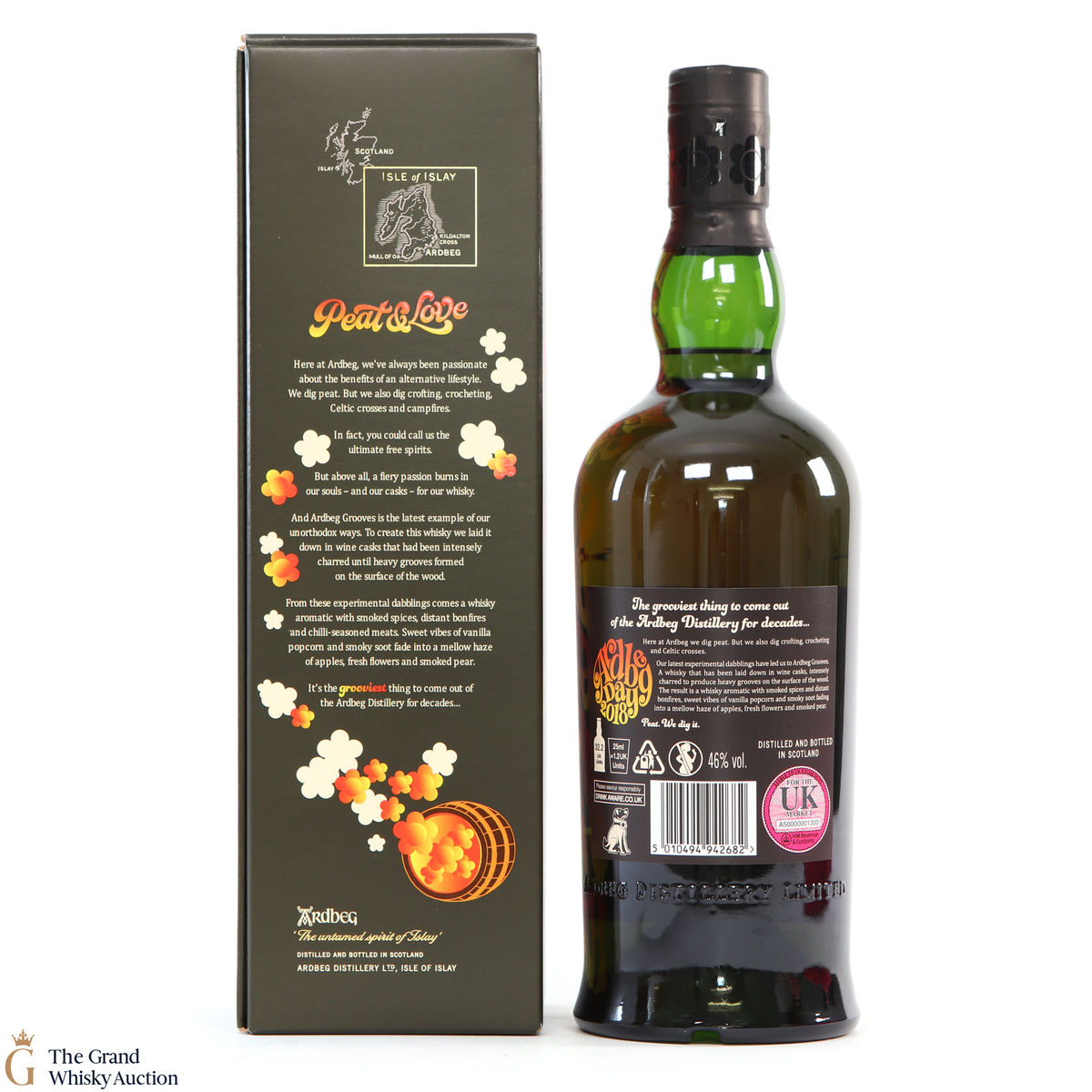 This limited edition Islay single malt was released to mark the 2018 Ardbeg Day at the Islay Festival of Music & Malt. The theme is a throwback to the Island's 1960s spirit, embodying the ideals of 'peat & love'! Ardbeg Grooves is crafted with ex-wine casks that are re-charred to create heavy grooves in the wood, allowing more interaction with the spirit and creating a richer flavour.