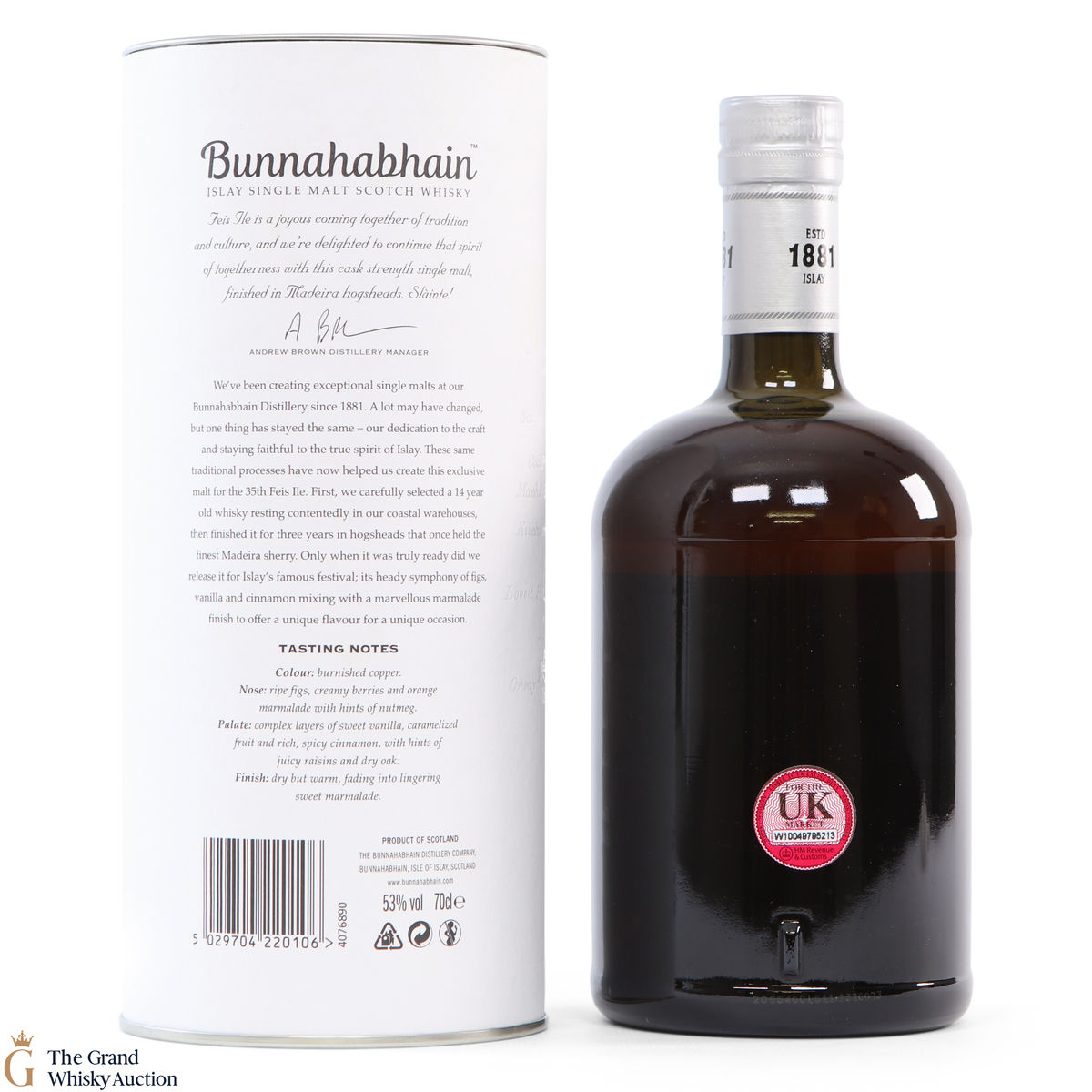 This limited edition single malt from Bunnahabhain Distillery was matured for 14 years in classic bourbon barrels, then finished in Maderia casks for another three years. Bottled at 53%, and released by Bunnahabhain for the 25th anniversary of Fèis Ìle - Fèis Ìle 2020. This is one of only 1164 bottles produced.