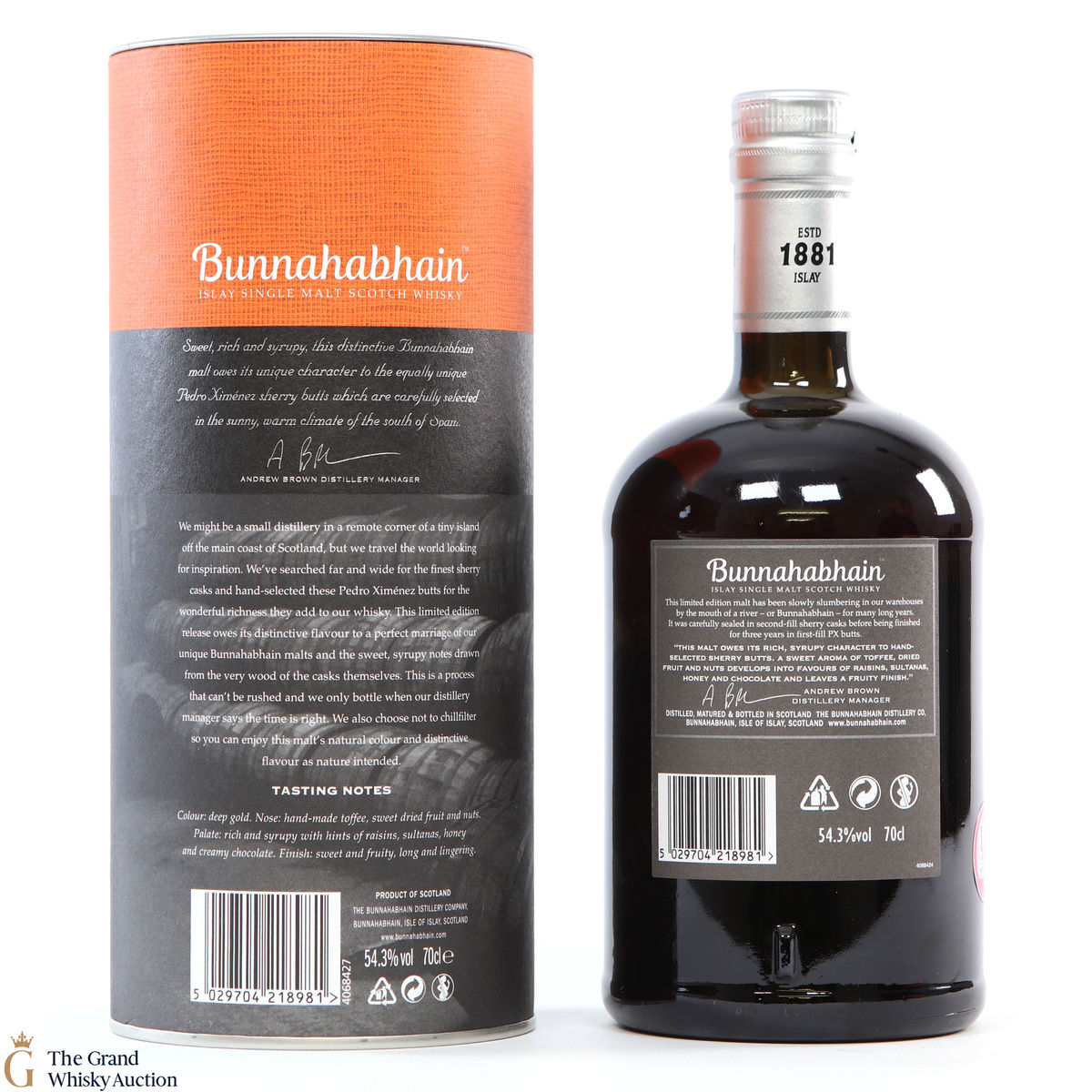 A limited edition bottling from the Bunnahabhain distillery on the north-east coast of Islay. This is a 14 year old single malt, distilled in 2003 and was initially aged in second-fill Sherry casks until 2011. At this point, the whisky was transferred over to yet more Sherry casks - first-fill Pedro Ximénez casks! It was bottled in 2017 at cask strength. This is one of individually numbered 6768 bottles.