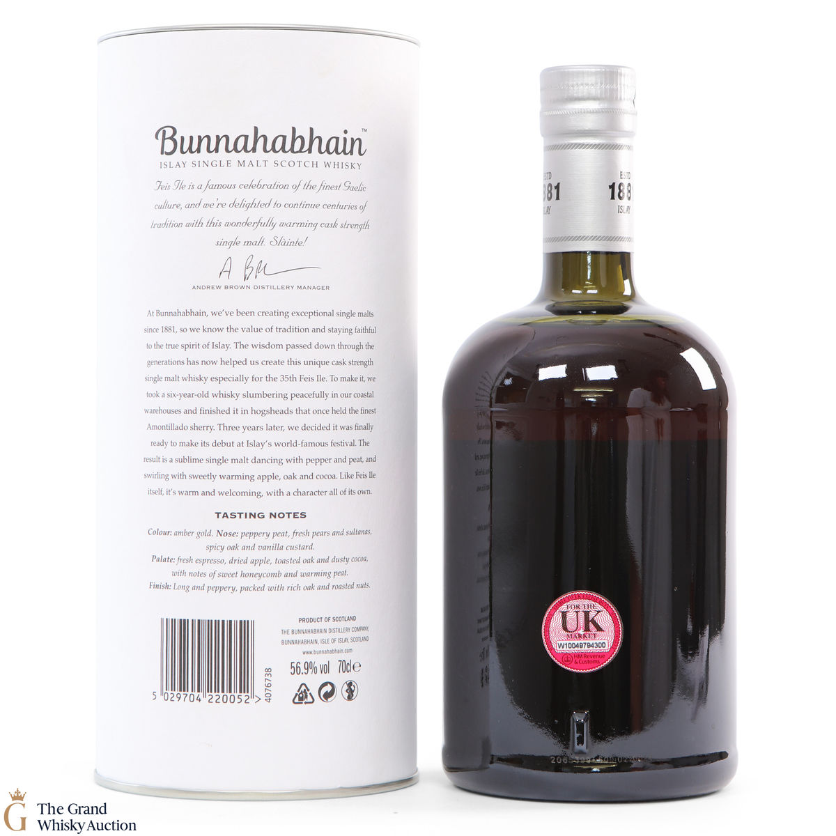 This limited edition single malt from Bunnahabhain Distillery was matured for 6 years in classic bourbon barrels, after which the single malt was transferred to Amontillado sherry Hogsheads for another three years. It was bottled at 56.9% and was released by Bunnahabhain for Fèis Ìle 2020. This is one of only 1658 bottles produced.