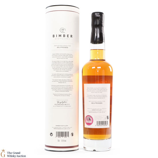 An exclusive partnership between the London distillery and department store Selfridges. This Bimber was made from single farm barley (which was malted at Westminster Maltings) and matured in four 1st fill American Oak Ex-bourbon casks. It was then finished in a single Oloroso sherry butt from hugely renowned Spanish sherry producer González Byass. Bottled in June 2020 at 51.5% ABV.