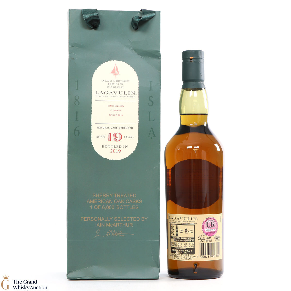 The 2019 Fèis Ìle release from Lagavulin was a 19 year old single malt, matured in three types of casks: refill American oak cask, second Sherry treated American oak cask and a European oak puncheon. 6000 bottles were released.