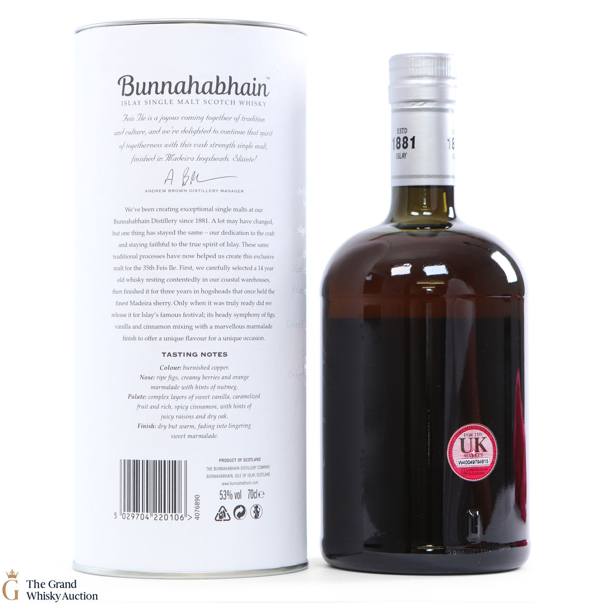 This limited edition single malt from Bunnahabhain Distillery was matured for 14 years in classic bourbon barrels, then finished in Maderia casks for another three years. Bottled at 53%, and released by Bunnahabhain for the 25th anniversary of Fèis Ìle - Fèis Ìle 2020. This is one of only 1164 bottles produced.