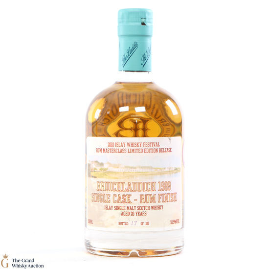 This 1989 vintage Bruichladdich was aged in a single cask and finished in a rum barrel. One of 105 bottles produced to celebrate the Rum Masterclass at the 2010 Islay festival. This is a 50cl bottling.