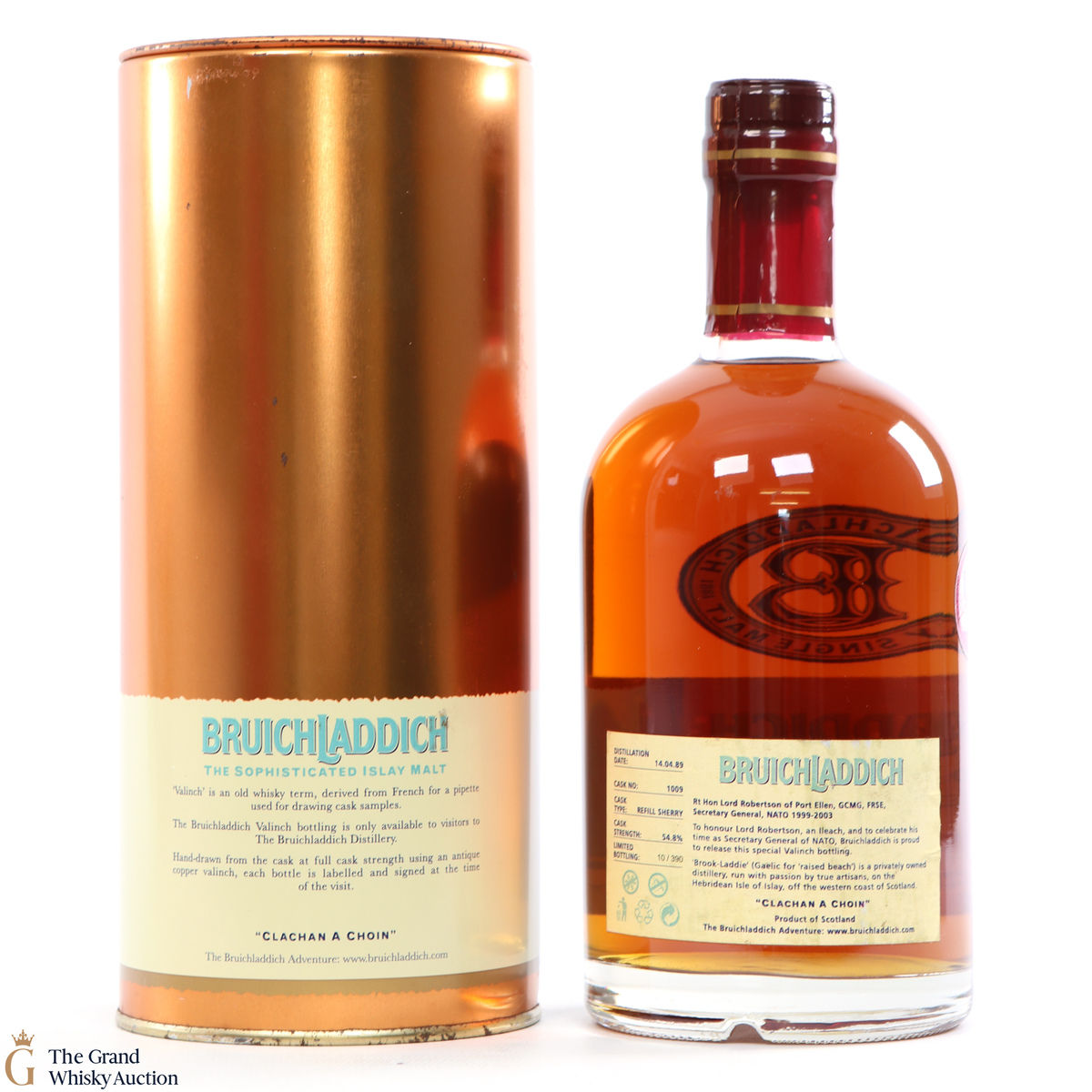 It bears a label that shows Lord Robertson of Port Ellen. This Valinch was matured in refill sherry cask number #1009 and only 390 were produced.