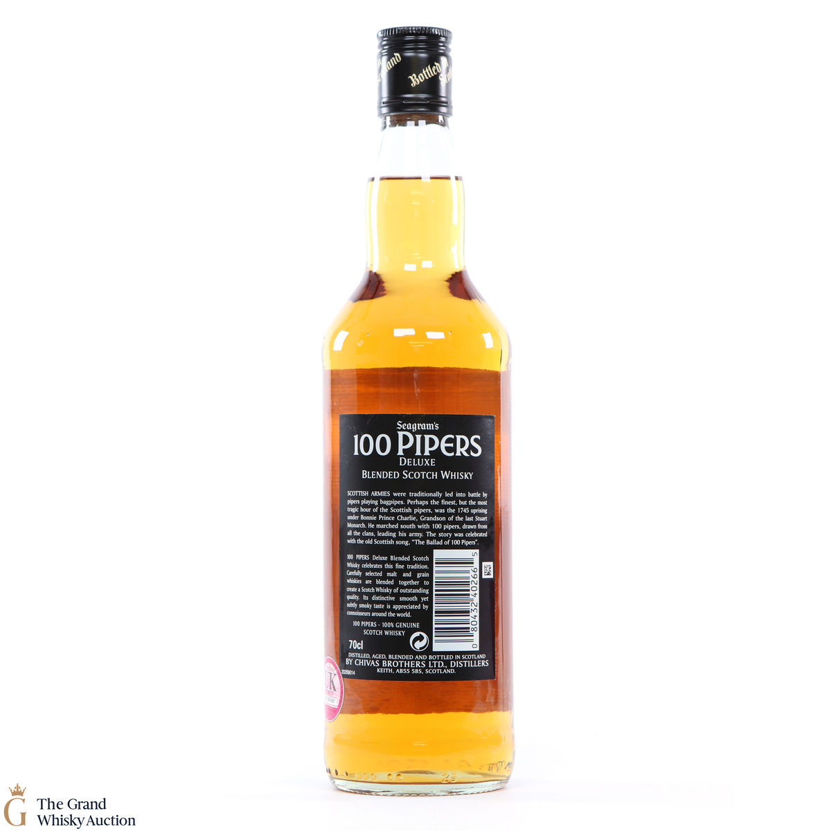 A 70cl bottling of Seagram's 100 Pipers Deluxe blended Scotch whisky, which was named after the 100 pipers that followed Bonnie Prince Charlie into battle.