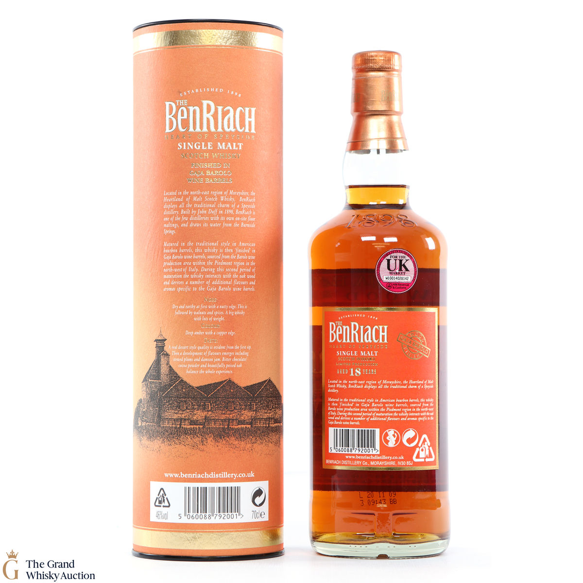 A special Benriach 18 year-old, maturred in American Bourbon casks and finished in casks previously containing Barolo wine from the famous Gaja estate.