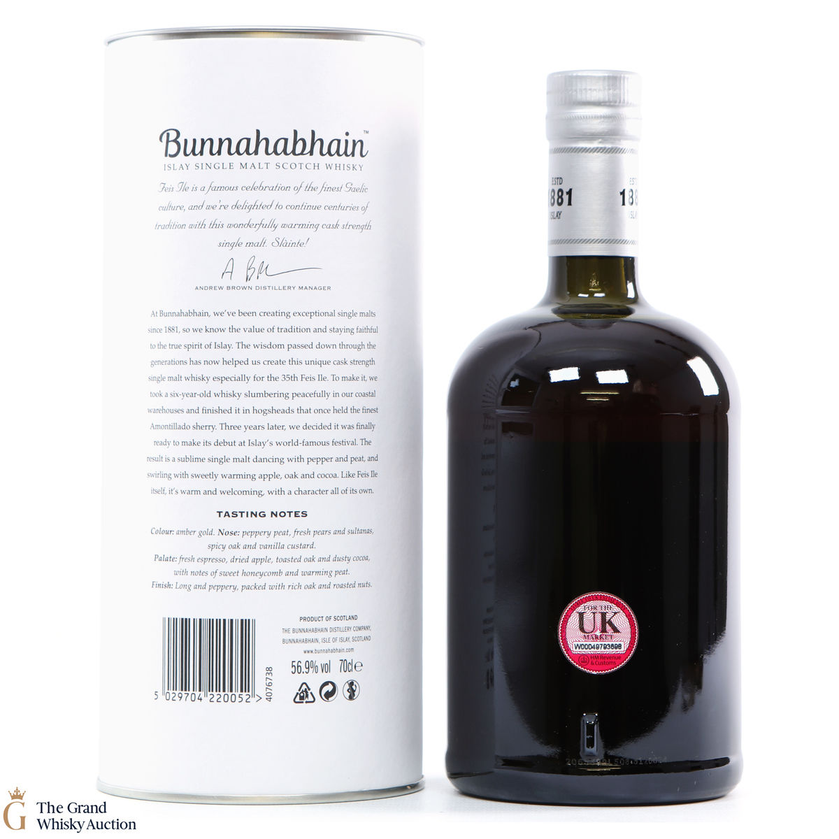 This limited edition single malt from Bunnahabhain Distillery was matured for 6 years in classic bourbon barrels, after which the single malt was transferred to Amontillado sherry Hogsheads for another three years. It was bottled at 56.9% and was released by Bunnahabhain for Fèis Ìle 2020. This is one of only 1658 bottles produced.