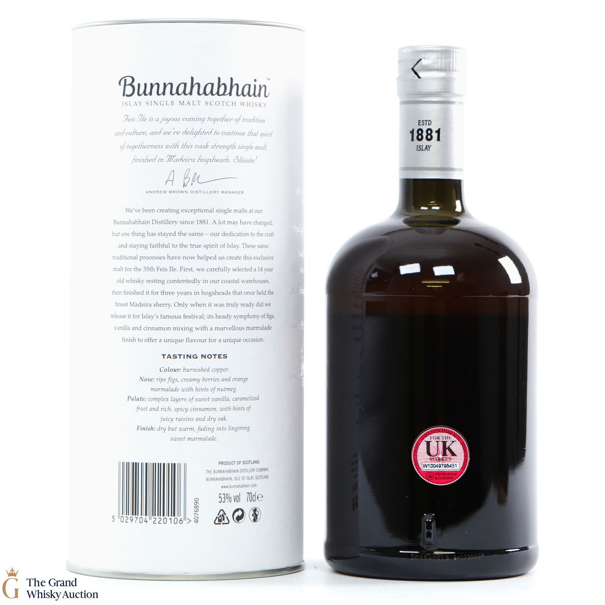 This limited edition single malt from Bunnahabhain Distillery was matured for 14 years in classic bourbon barrels, then finished in Maderia casks for another three years. Bottled at 53%, and released by Bunnahabhain for the 25th anniversary of Fèis Ìle - Fèis Ìle 2020. This is one of only 1164 bottles produced.