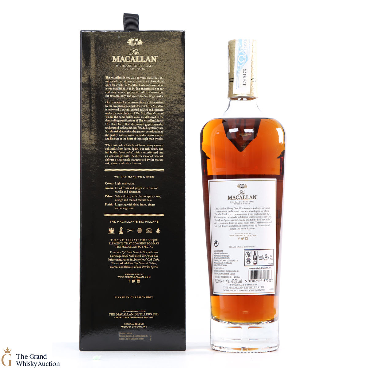 This annual release of The Macallan's popular 18 Year Old Sherry Oak is matured exclusively in sherry seasoned casks, built from both Spanish and American oak, providing a beautifully dark flavour with rich aromas.