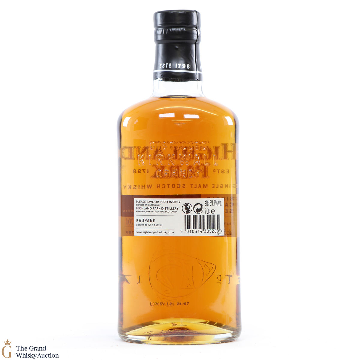 This bottling is part of Highland Park's Single Cask Series and was bottled as Kaupang. Distilled in 2003, this single malt was matured for 13 years in Refill Butt #5709 at the cask strength of 59.7% ABV. With only 552 bottles available, this is a limited edition.