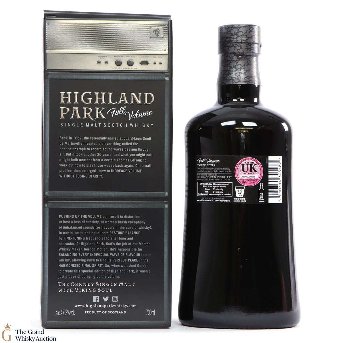 Full Volume by Highland Park was distilled in 1999 and bottled in 2017 from 481 casks. The single malt was matured exclusively in first-fill bourbon casks and was bottled at 47.2% ABV and comes presented in a themed presentation box resembling speaker.