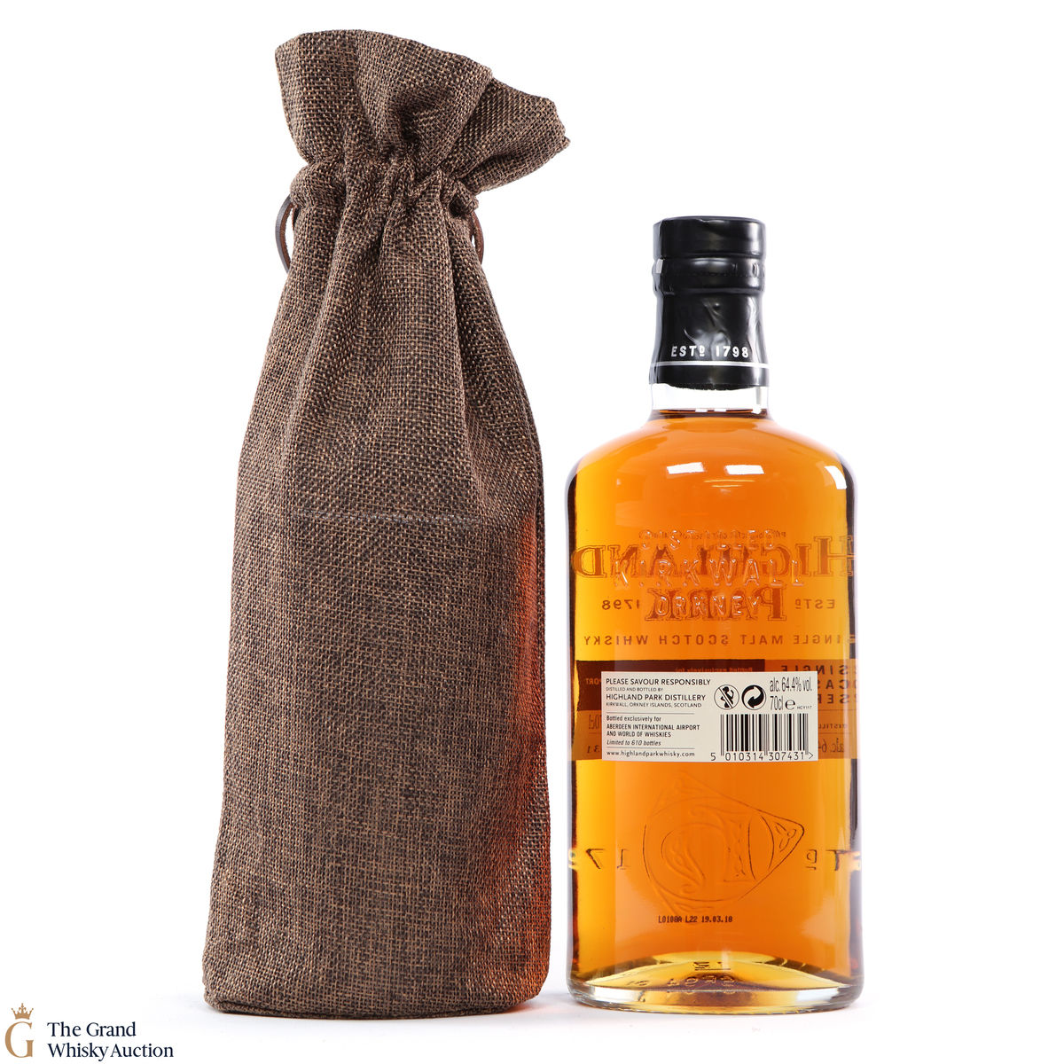 This Highland Park Single Cask Edition was bottled in 2018 exclusively for Aberdeen International Airport and World of Whiskies. With just 610 bottles available, the 12-year-old single malt whisky is drawn from an intriguing mix of American/Spanish oak cask and bottled at a cask strength 64.4% ABV.
