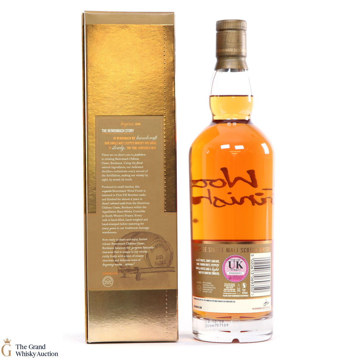 A 2010 vintage Benromach, released as part of Benromach's Wood Finish series. This single malt has been aged in first-fill bourbon then finished in Chateau Cissac wine casks from the Haut-Médoc region of Bordeaux. Bottled in 2018.