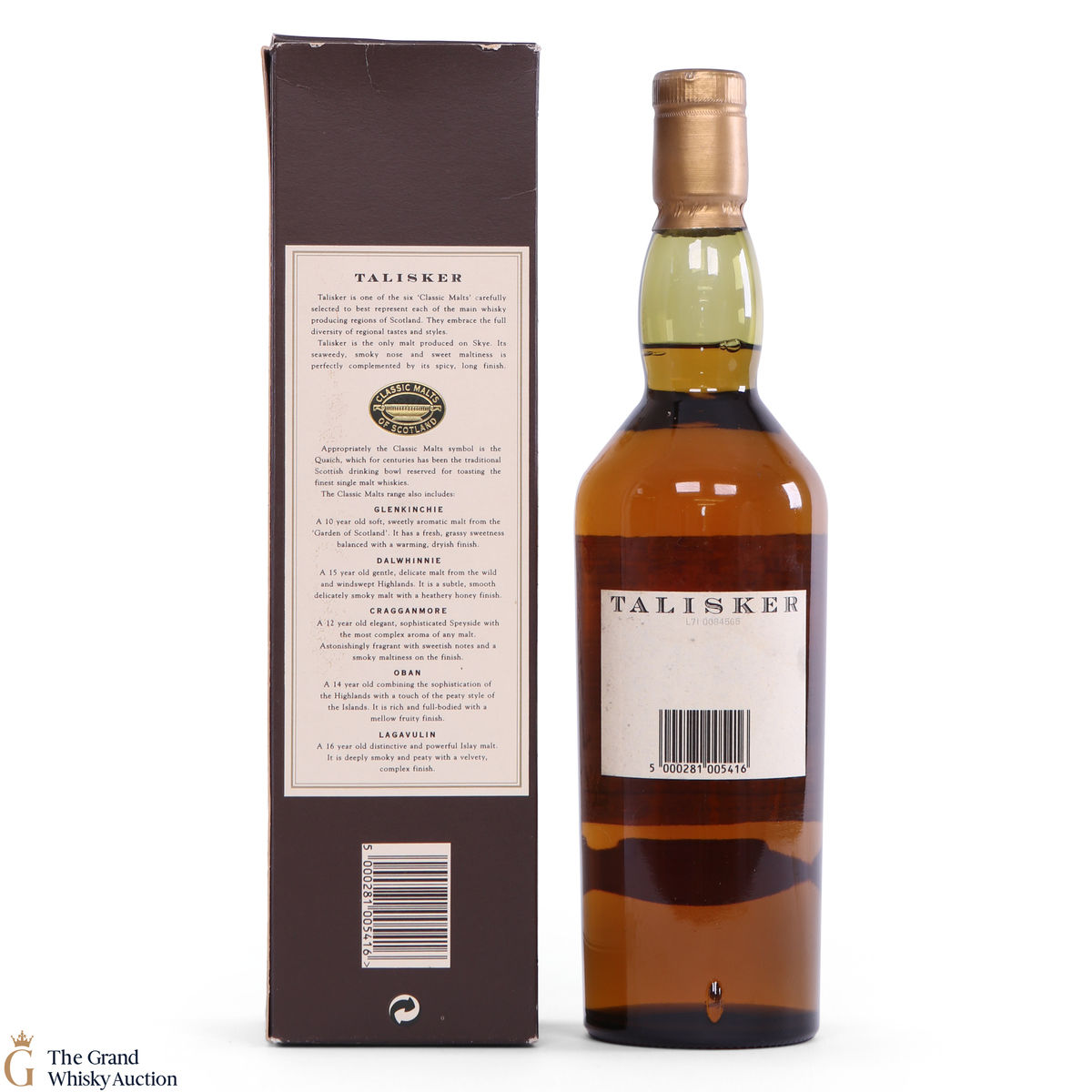 An older release of 10 Year Old from Talisker distillery on the Isle of Skye. Aged for a minimum of 10 years in American oak casks. The bottle label and the box feature a map of Skye.