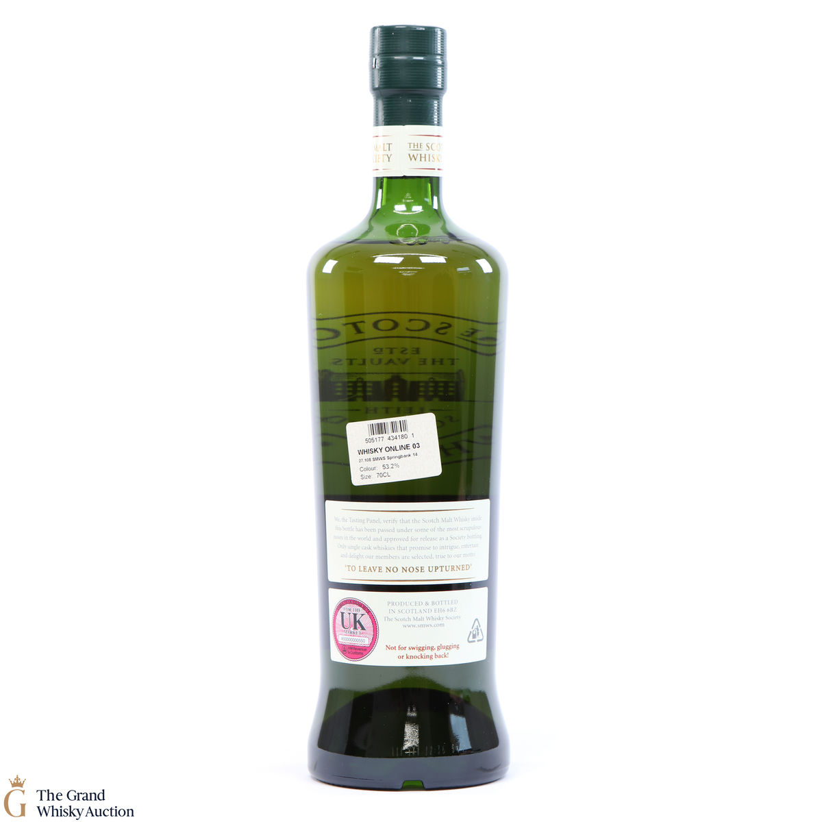 Due to the various ages of bottles and their seals, the condition of liquid is at the buyer's discretion and no claim can be lodged against failure/leakage in transit. Loss and breakage cover is available at 3% of the hammer price as standard. If the lot is not insured, no claim can be lodged against the courier or The Grand Whisky Auction for breakage or loss in transit.