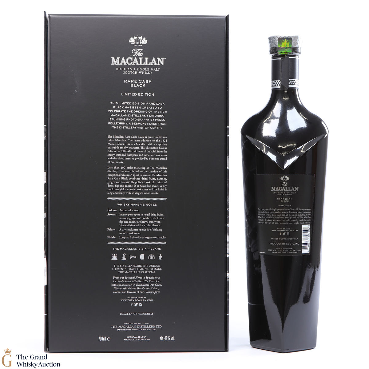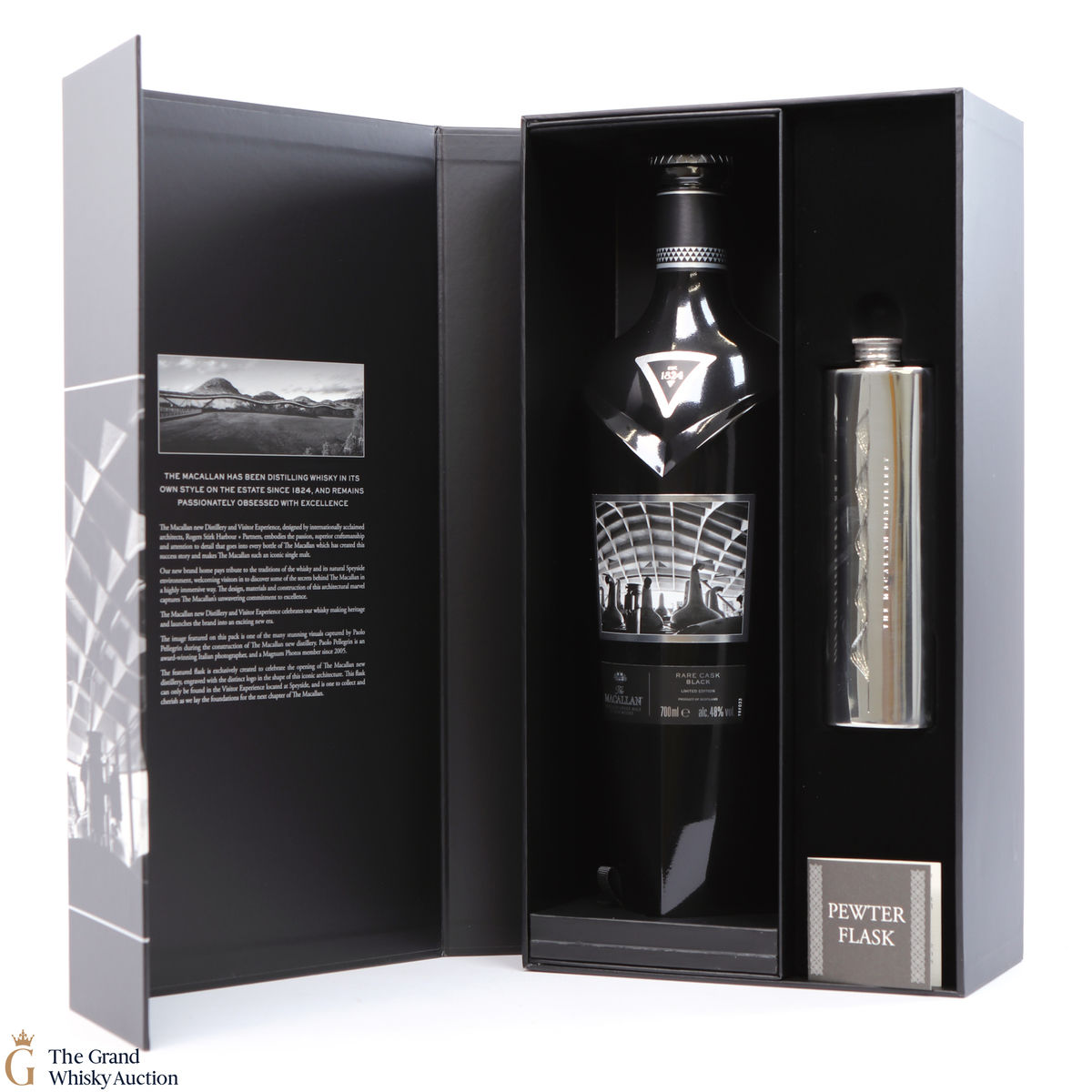 The Macallan Rare Cask Black Limited Edition was released to celebrate the opening of the new Macallan Distillery. It is part of the Macallan 1824 series and features stunning photography by Paolo Pellegrin and a bespoke flask from the Distillery Visitor Centre. The release was a limited edition of 7000 sets, which were only available at airports.