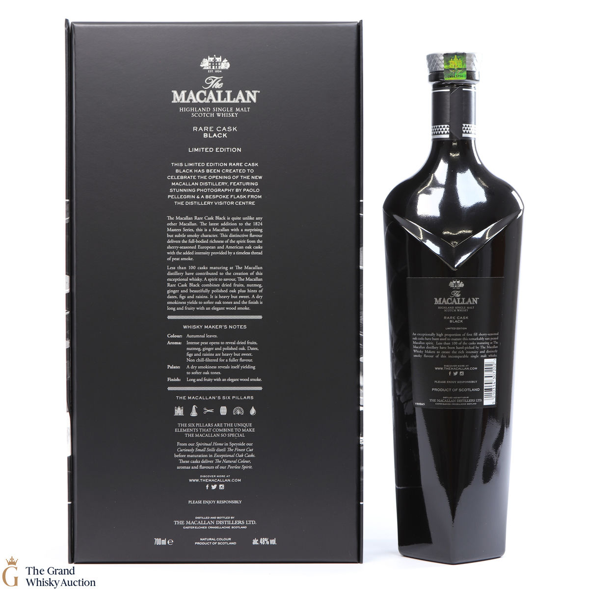 The Macallan Rare Cask Black Limited Edition was released to celebrate the opening of the new Macallan Distillery. It is part of the Macallan 1824 series and features stunning photography by Paolo Pellegrin and a bespoke flask from the Distillery Visitor Centre. The release was a limited edition of 7000 sets, which were only available at airports.