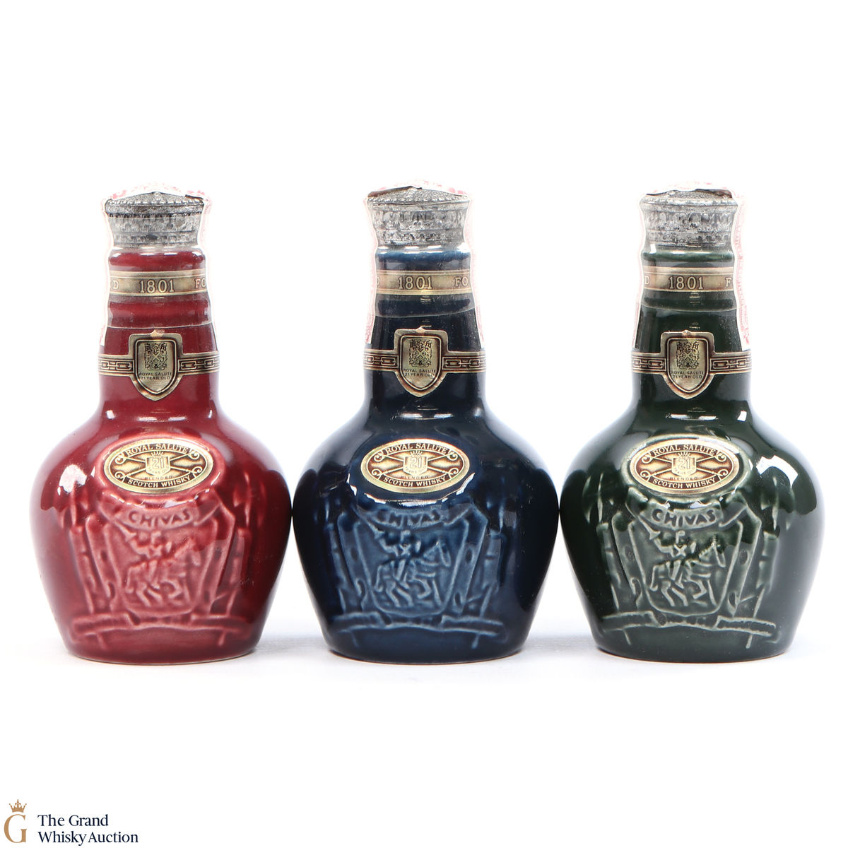 Three Chivas Royal Salutes, in miniature Wade decanters. Ruby, Emerald and Sapphire.