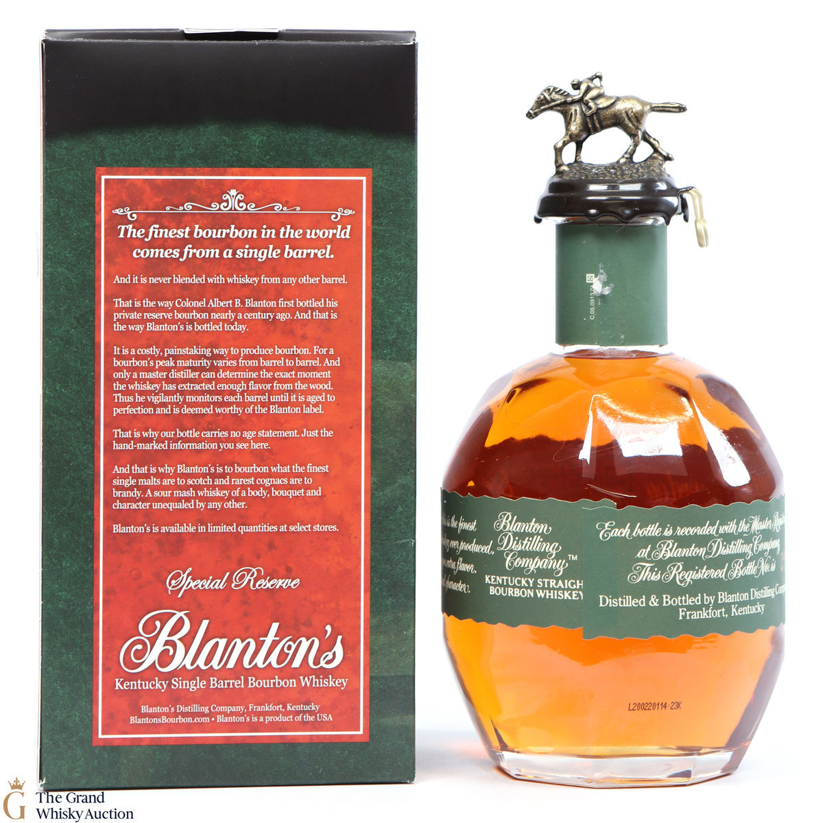 Blanton's Single Barrel Special Reserve is a lower strength single barrel bourbon. Dumped Date. Each bottle is hand-filled, hand-labelled, hand-sealed and individually numbered. 80 Proof.