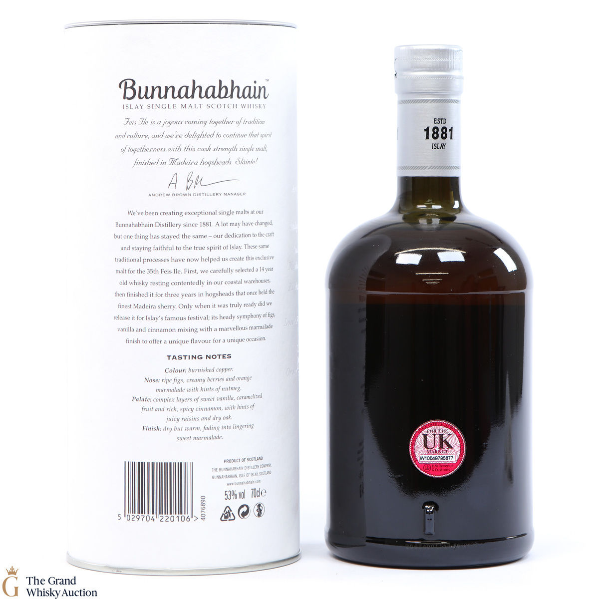 This limited edition single malt from Bunnahabhain Distillery was matured for 14 years in classic bourbon barrels, then finished in Maderia casks for another three years. Bottled at 53%, and released by Bunnahabhain for the 25th anniversary of Fèis Ìle - Fèis Ìle 2020. This is one of only 1164 bottles produced.