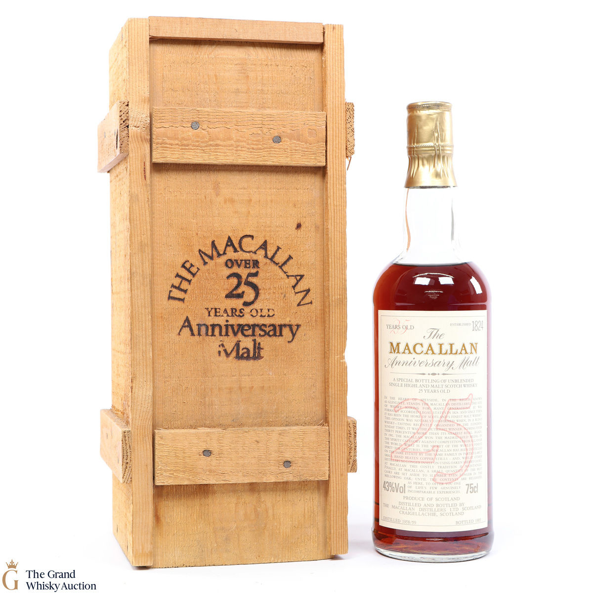 This is an incredibly rare 25 year old Speyside single malt. It was distilled at The Macallan in 1958/1959. It was bottled in 1985 for the highly decorated Anniversary Malt range. This a 75cl bottle.