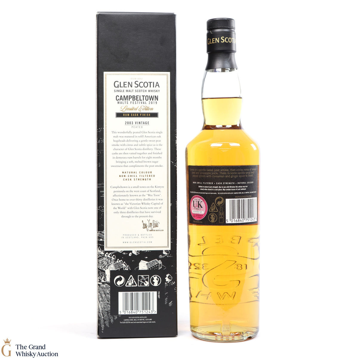 Bottled for the 2019 Campbeltown Malt Festival this 2003 Vintage peated bottling of Glen Scotia is limited edition and has been finished in Rum casks.